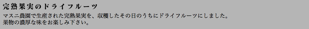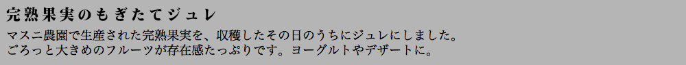 マスニ農園の果物を使用し、その味、香り、色を感じてほしいので余計な物は一切添加しておりません。誰でも安心してお召し上がりいただけます。